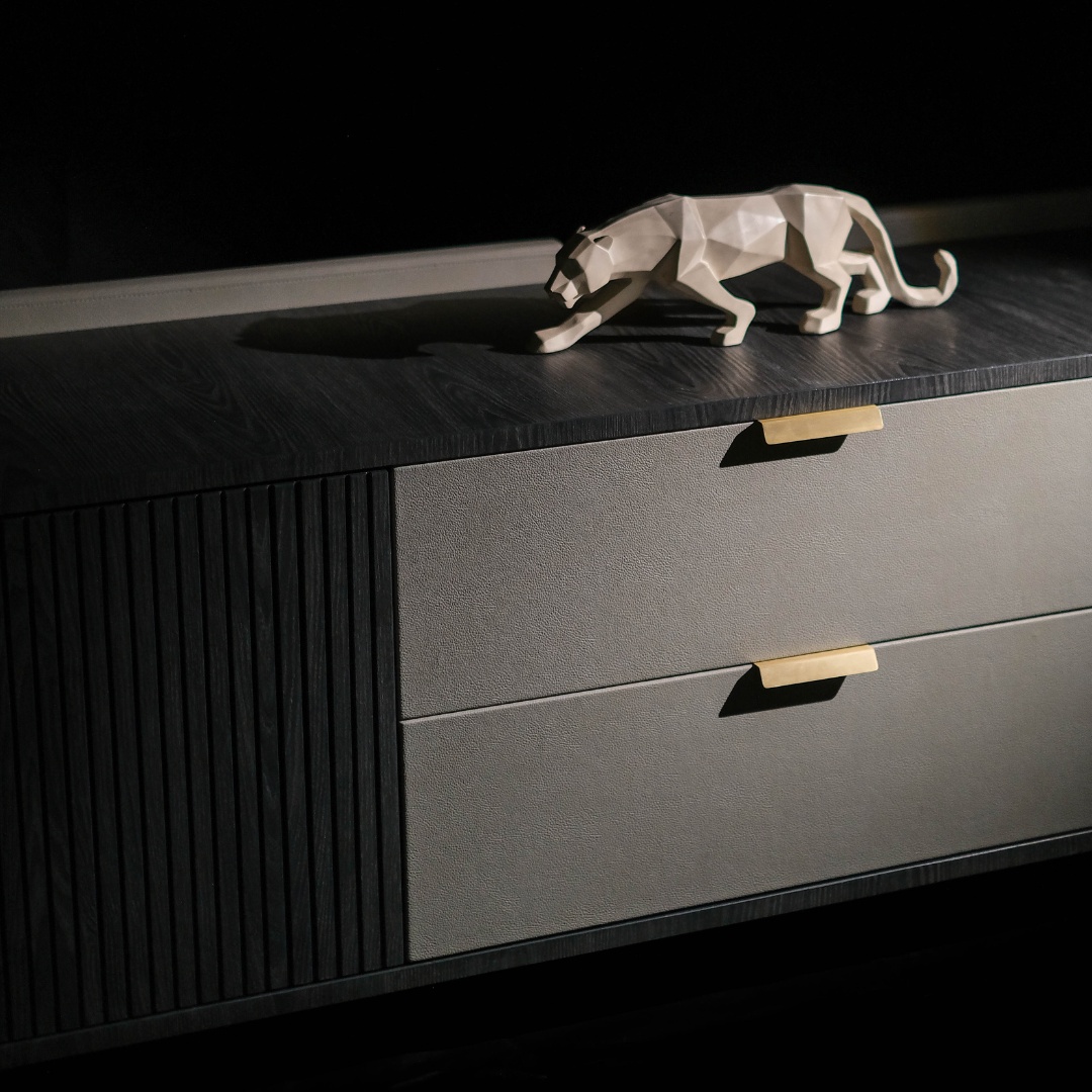 The Milano Sideboard – where luxury meets modernity. Impeccably crafted with plywood and veneer, adorned with leather wings and antique brass handles. This masterpiece blends timeless style and contemporary design.